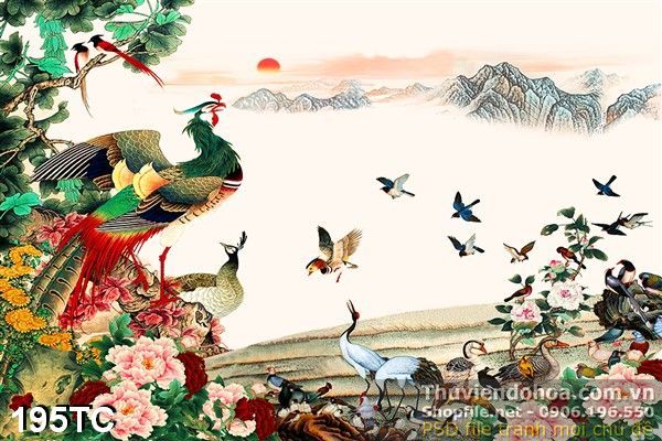 Tranh chim công và đàn chim nhỏ chơi đùa in uv