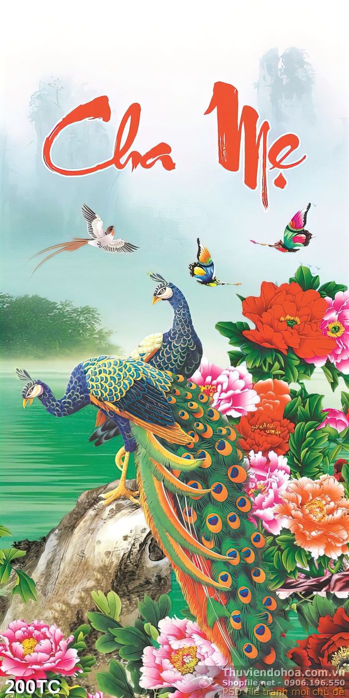 Tranh chim công cha mẹ khổ dọc và hoa mẫu đơn 3d in uv