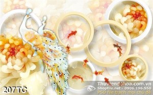 Tranh chim công 3d giả ngọc và đàn cá koi in uv psd
