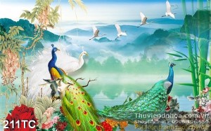 Tranh chim công lộng lẫy và đàn cò trắng psd