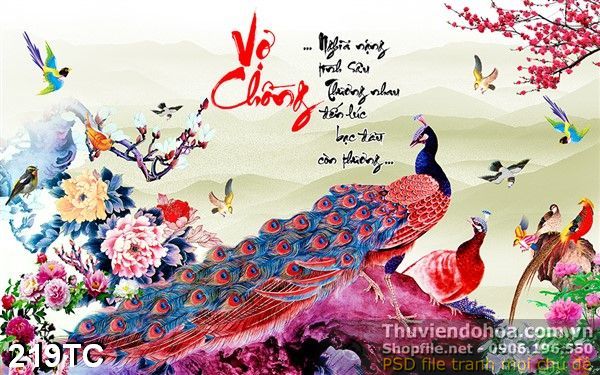 Tranh chim công vợ chồng màu hồng đẹp 3d