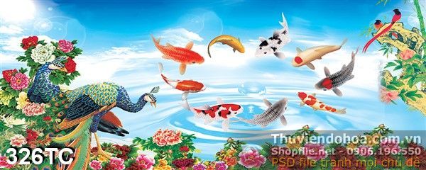 Tranh chim công và cửu ngư quần hội in uv