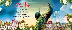 Tranh chim công cha mẹ và chim công đậu trên cây hoa mẫu đơn
