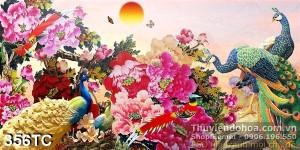 Tranh chim công hoa mẫu đơn khổ ngang đẹp