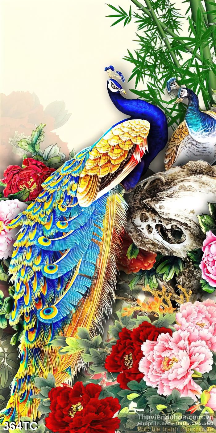 Tranh chim công đẹp khổ dọc 3d