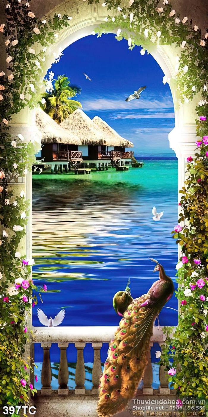 Tranh chim công bên ban công nhìn ra biển in uv wall