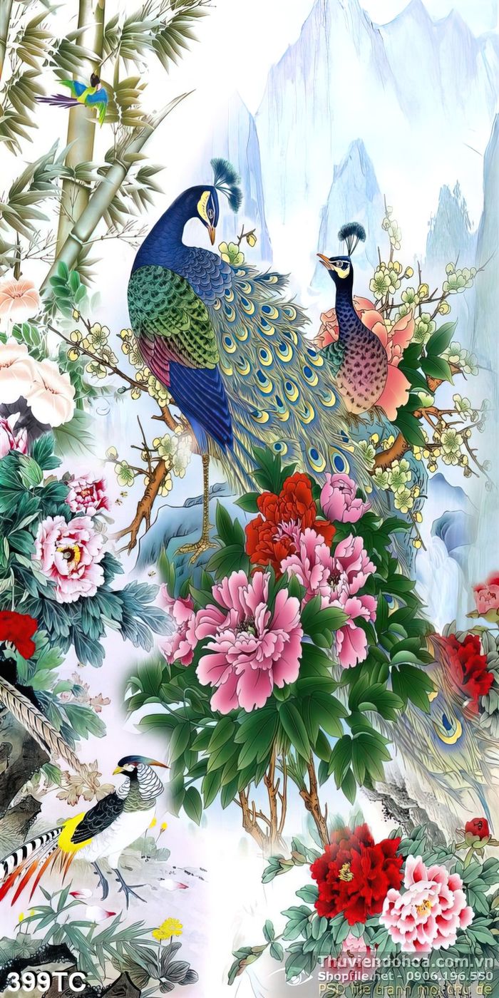 Tranh chim công vui đùa bên nhau và hoa mẫu đơn