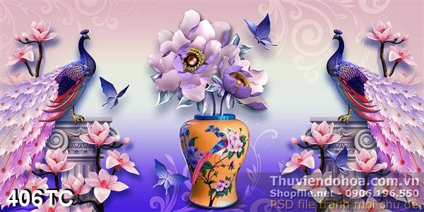 Tranh chim công 3d điêu khắc và bình hoa cổ