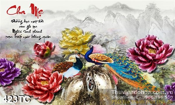 Tranh chim công cha mẹ hoa mẫu đơn 3d giả ngọc