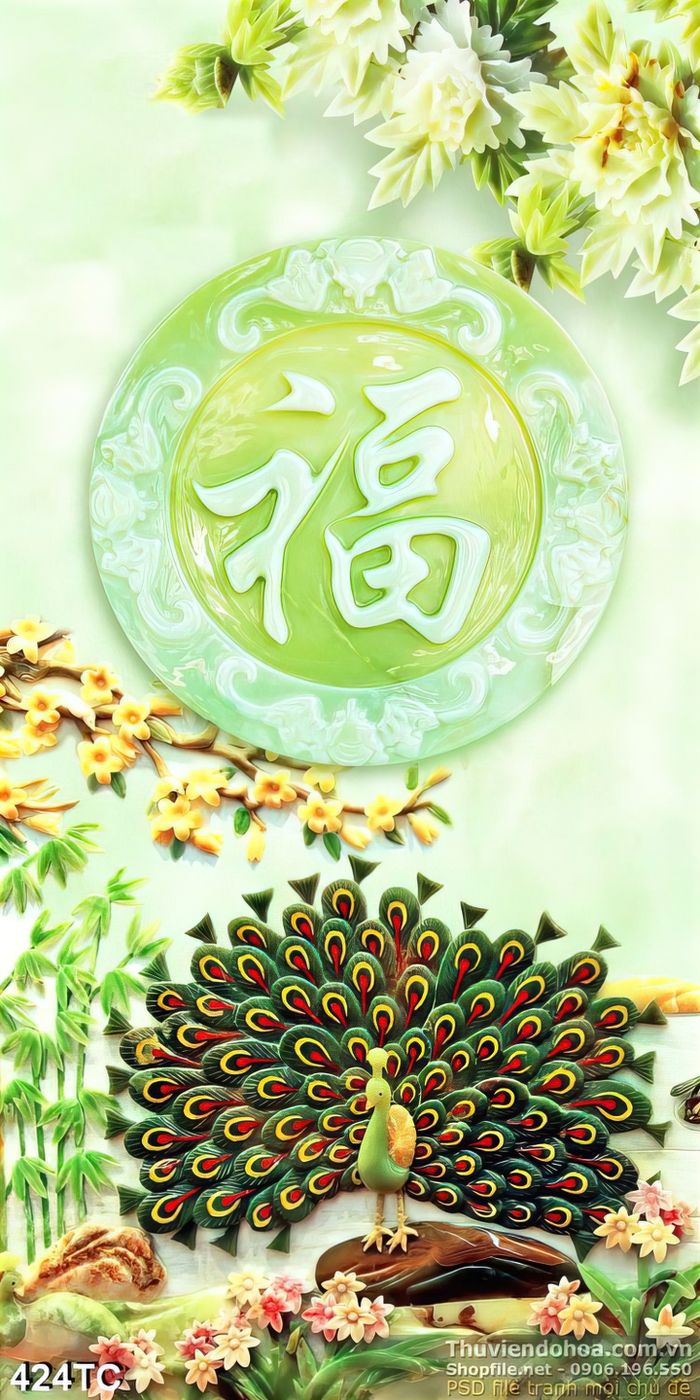 Tranh chim công 3d wall xòe đuôi giả ngọc ấn tượng