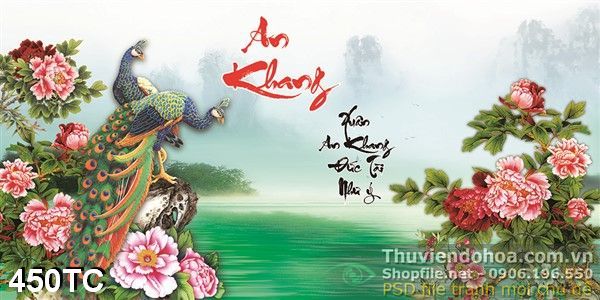 Tranh chim công an khang và hồ nước xanh psd