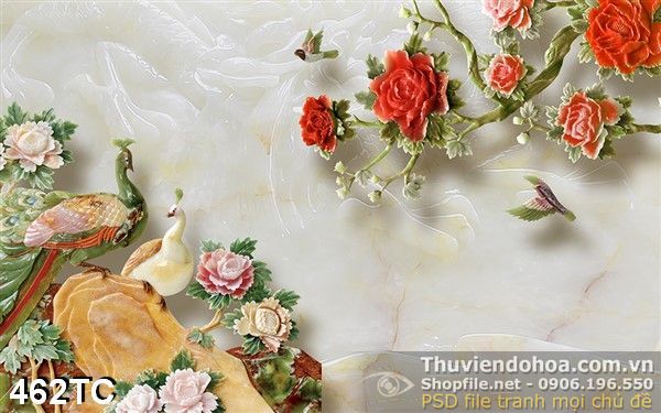Tranh chim công 3d giả ngọc wall hoa hồng đỏ