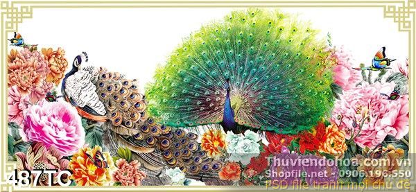 Tranh chim công đực xòe đuôi tán tỉnh con cái psd in uv