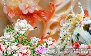 Tranh chim công 3d giả ngọc hoa mẫu đơn và hoa mai