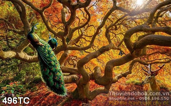 Tranh chim công đậu trên cành cây già trong rừng psd