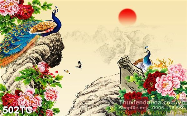 Tranh chim công mặt trời và hoa mẫu đơn đẹp