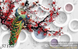 Tranh chim công 3d và cành hoa đào đỏ lớn