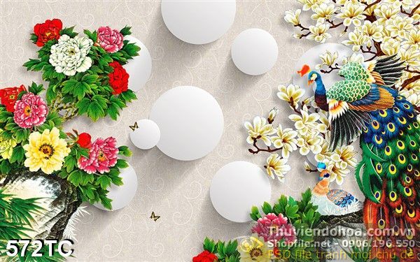 Tranh chim công khoe sắc với cái hình tròn màu trắng