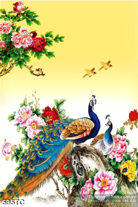 Tranh chim công hoa mẫu đơn và 2 chú chim nhỏ