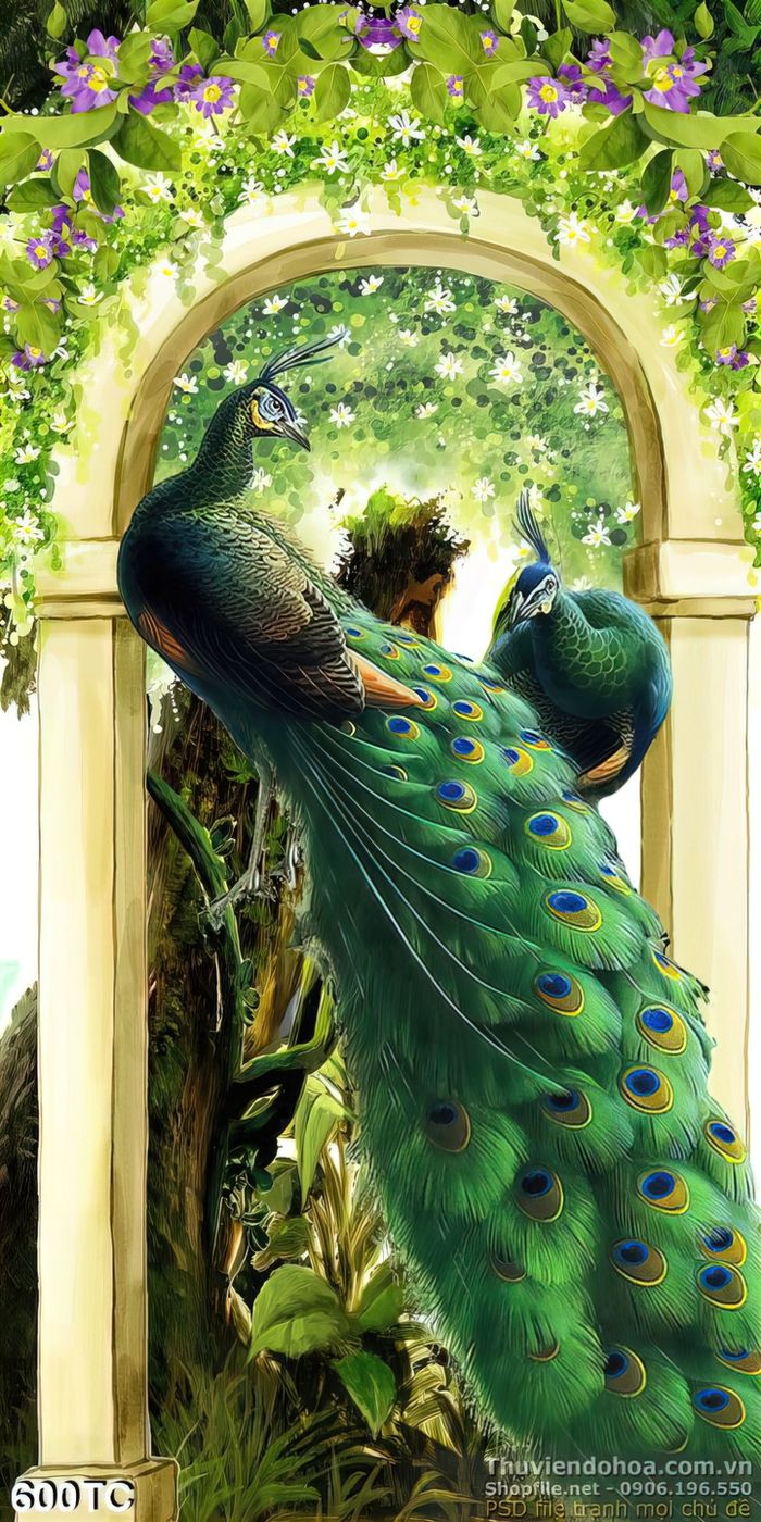 Tranh chim công đẹp màu xanh lam khổ dọc 3d