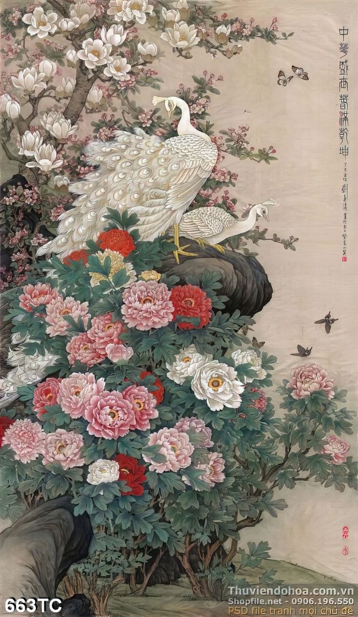 Tranh chim công vẽ tay và bụi hoa mẫu đơn in uv