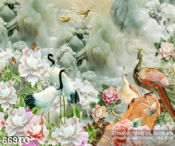 Tranh chim công giả ngọc 3d và con chim hạc