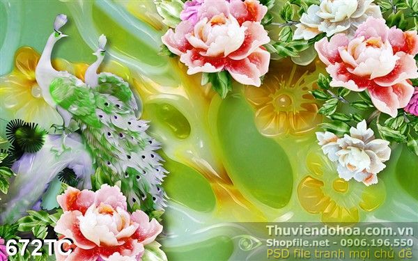 Tranh chim công màu xanh và hoa mẫu đơn 3d