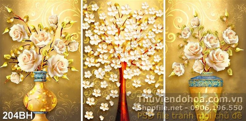 Tranh chậu hoa bộ 3 tấm treo tường mạ vàng 2020