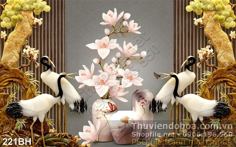 Tranh bình hoa nghệ thuật và chim hạc 3d wall