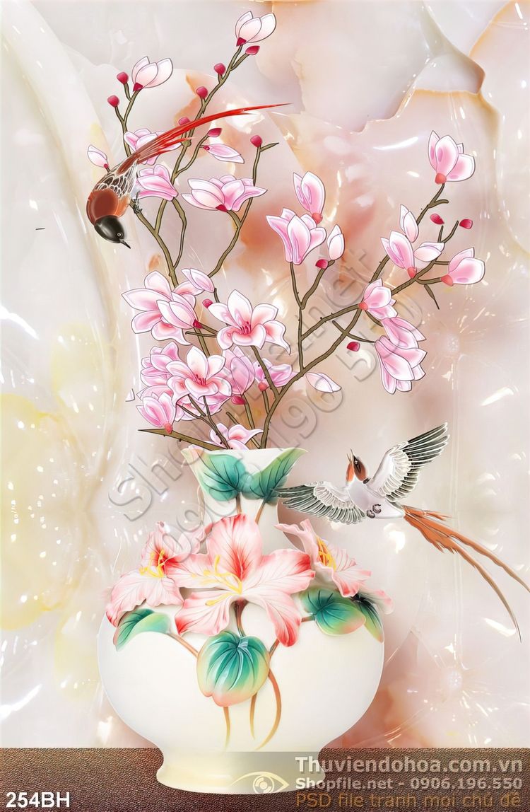 Tranh bình hoa giả ngọc và hoa đào nở wall